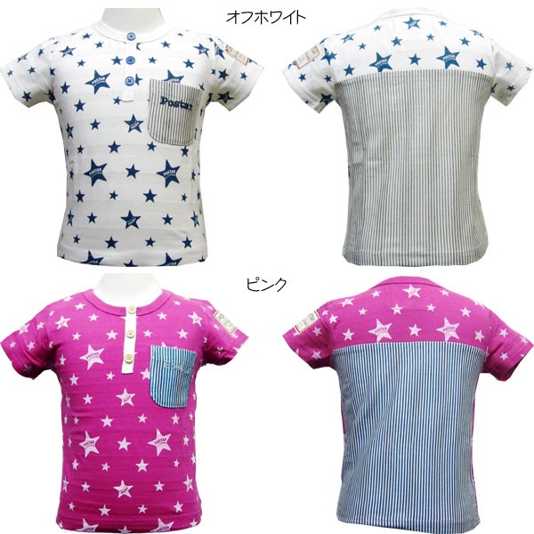 コメント:ヘンリーネック風のギミックTシャツ♪夏に涼しいシャドーボーダー生地です。※90~95cmは左肩スナップボタン付きです。