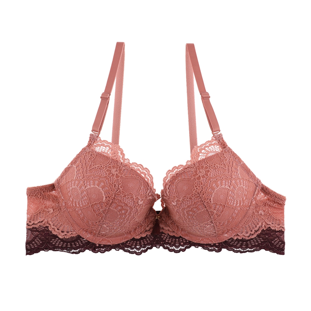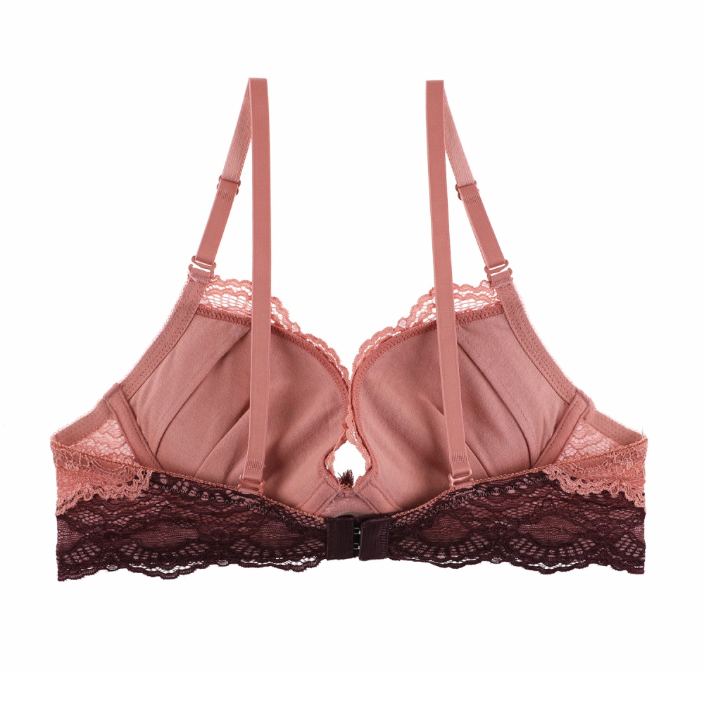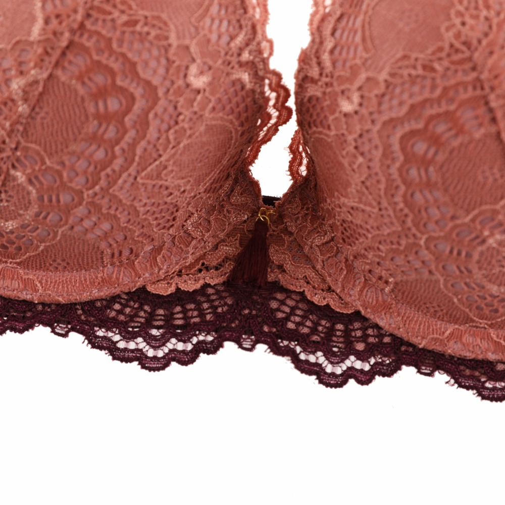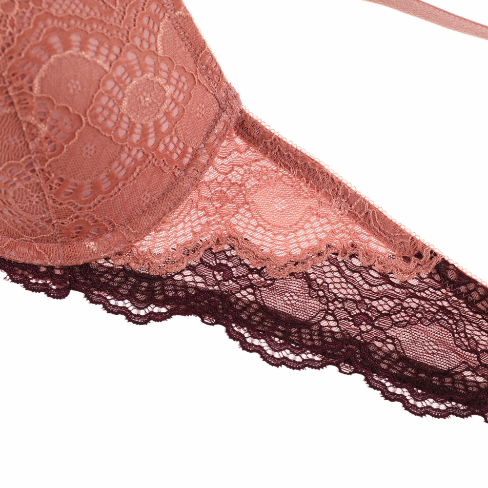 아이쉐도우 컬러에서 영감을 받은 제품. 그라데이션 쉐도우를 하듯이 핑크브라운 컬러와 와인컬러를 투톤으로으로 매치한 레이스 브라.