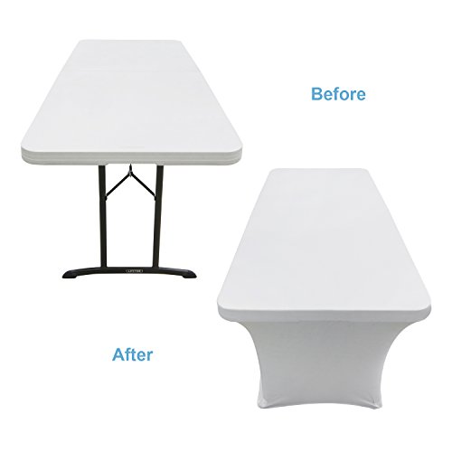 -. Title : Houseables White Table Cloths, Fitted Tablecloth Cover, 6 ft, Rectangular Skirts, Polyester/Spandex, Elastic, Stretchable Linen, Stain & Wrinkle Proof, for Folding Tables, Wedding, DJ, Events