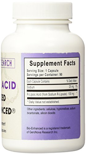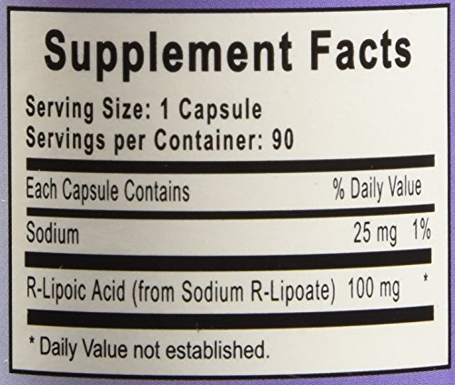 R Lipoic Acid 100 mg 90 vcaps INGREDIENTS: SERVING SIZE: 1 Vegetable Capsule SERVINGS PER CONTAINER: 90 AMOUNT PER SERVING: R-Lipoic Acid 100 mg Cellulose potassium bicarbonate sodium bicarbonate. Free of yeast wheat corn milk soy glutens sugar or animal products. 100% vegan. SUGGESTED USAGE: Take 2 to 4 capsules daily or as directed by your health care provider. WARNINGS: None