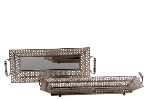 Metal Rectangular Tray with Mirror Surface 2 Metal Handles & Pierced Metal Sides Set of Two Polished Chrome Finish Silver