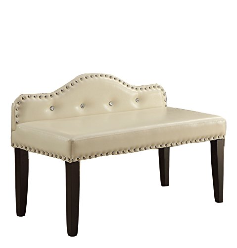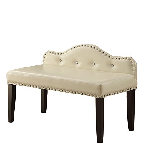 -. Brand : Furniture of America -. Color : off white -. EAN : 9399293733742 -. Feature : Smooth leatherette upholstery adorned with eye-catching crystal-like acrylic buttons / Curvaceous camelback structure outlined with shined nailhead trim for modern approach / Bench easily doubles as a footboard by the end of a bed. Supported upon espresso finished wood legs / Foam filled cushions for comfortable relaxation. Unexpected elegance, charm and convenience is at your beck and call. / Large dimensions: 27.0" H x 42" W x 19" D. Assembly Required. Off-white color -. Label : Furniture of America -. Manufacturer : Furniture of America -. PackageQuantity : 1 -. ProductGroup : Furniture -. ProductTypeName : HOME_FURNITURE_AND_DECOR -. Publisher : Furniture of America -. Size : Small -. Studio : Furniture of America -. Title : Ivory Faux Leatherette Camelback Button Tufted Accent Bench in Off-White (Small)
