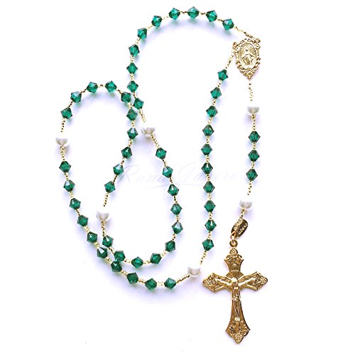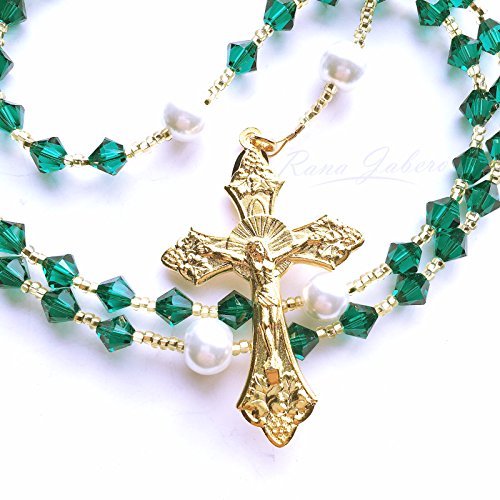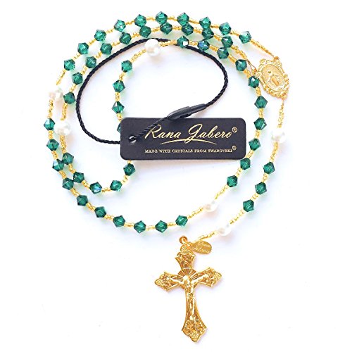 -. Binding : Jewelry -. Brand : Rana Jabero -. Department : unisex-adult -. Feature : This Rosary is made with genuine 6mm Swarovski® crystal beads in Emerald color, which is also the birthstone color for May. 8mm glass pearls were also used for the Our Father beads. / Measures approximately 18 inches in length. / Gift box included with each Rosary. / Authentic Rana Jabero® piece. Tag included with each item. -. Label : Rana Jabero -. Manufacturer : Rana Jabero -. ProductGroup : Jewelry -. ProductTypeName : FASHIONNECKLACEBRACELETANKLET -. Publisher : Rana Jabero -. Studio : Rana Jabero -. Title : Rana Jabero Gold Plated Emerald Green (May Birthstone) Swarovski Crystal and Glass Pearl Rosary