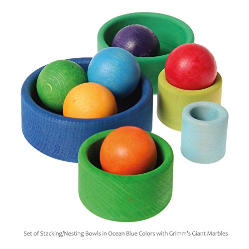 These five adorable little wooden bowls can be nested together, stacked in a variety of ways, or used imaginatively as play dishes and cups: these stacking bowls are incredibly versatile! While playing, young children can learn about size and sequencing as well as exercise their fine motor skills. Durable, heirloom-quality toy is a great addition to any daycare, preschool, or home. Stacked height of these Lollipop color Bowls about 8 inches, about 4 inches in diameter. The largest bowl measures 4 in. diameter by 1.5-inches tall. The smallest bowl measures approximately 1.25-inches in diameter. Made in Germany. This toy is made from European alder wood and finished with nontoxic, water based dyes. Wood is an ideal material for children's toys, as bacteria cannot reproduce on wood. Most Grimm's products are grinded by hand -- which gives a more charming expression compared to machined products. All dyes used are water based and in accordance with EN-71, are harmless to your health and suitable for children toys. The same is true for the natural oil used. These small wooden bowls from Grimm's (in the rainbow colors) was a winner of the prestigious SPIEL GUT ("Good Toy") Award, -- a quality mark awarded by the German Design Association's Committee of Games and Toys. Such an award recognizes high quality children toys that are also ecologically sensible. Also available in several other color styles (Rainbow and Lollipop).Feature