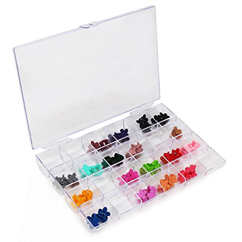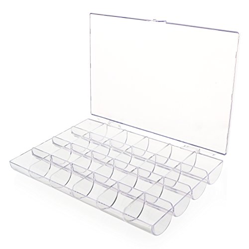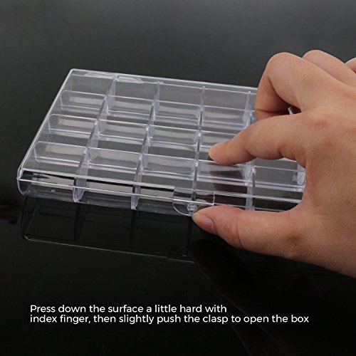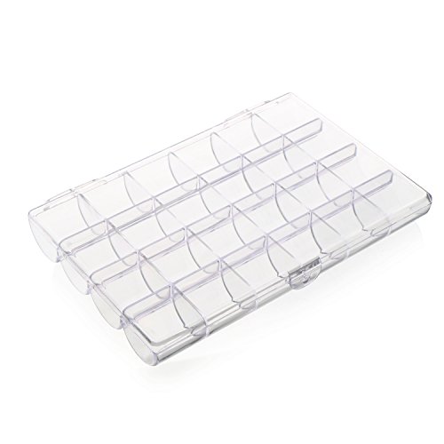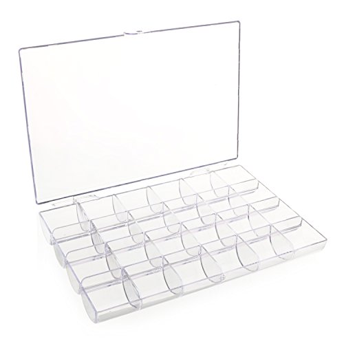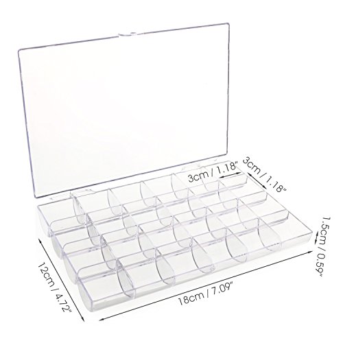 -. Feature : Not only perfect to storage earrings, necklaces, finger rings, nose studs or other small jewelry kits, but also handy to hold plant seeds, small screws, washers, buttons, beads and any small components use in craft work. / Every compartment is in the right size to storage a pair of ear ring, and 24 Compartments are enough for you to keep all small jewelry accessories in a tidy and clear way. / Transparent box displays your jewelry in good order, so you can see and find what you want in an instant, saving the time of searching any suitable accessories. / Unique Modeling -- Semicircular compartments help you take out something smooth like beads with ease; Dividers go all the way to the lid, preventing the stored accessories going into another compartment; The box closes easily to achieve dust prevention. / Overall Size: 18 × 12 × 2.3cm / 7.09 × 4.72 × 0.91" Compartment Size: 3 × 3 × 1.5cm / 1.18 × 1.18 × 0.59"