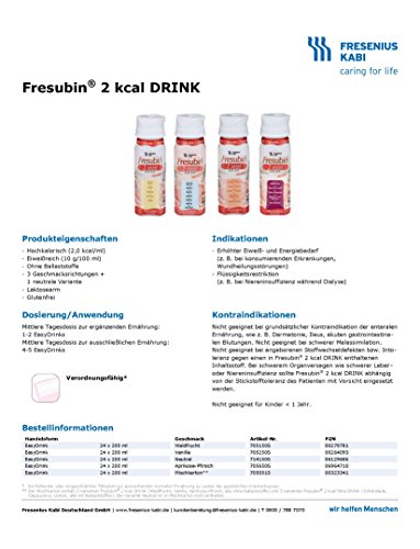 -. Feature : Fresubin 2 kcal DRINK / Eiweißreiche Trinknahrung mit sehr hoher Energiedichte / Bedarfsdeckende Versorgung mit Vitaminen und Spurenelementen / Fresubin 2kcal DRINK schmeckt leicht gekühlt am besten! / Geschmacksrichtung: Vanille