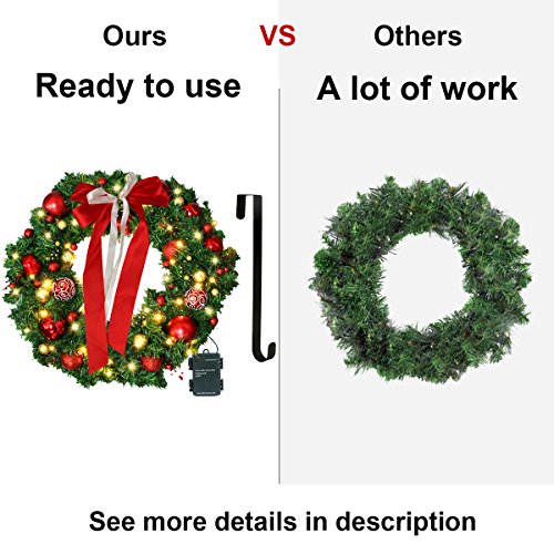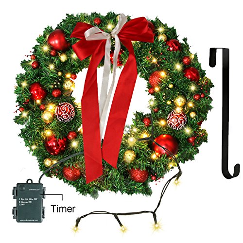 Christmas Wreath with LED Lights - Christmas Garland - Artificial Xmas Pine Wreath - Battery Operated Over 200 Hours - Christmas Decorations - Including Wreath Hanger, Ornaments ,Led Lights - 24 Inch