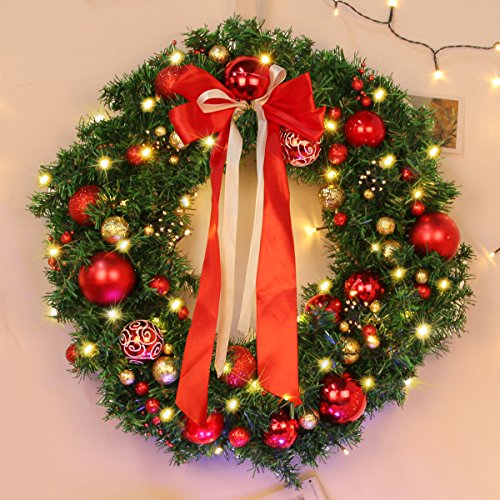 【LED LIGHT - CHRISTMAS ORNAMENTS - WREATH HANGER】 24'' Christmas wreath comes with 17' LED string light, dozens of ornaments, and a 15'' wreath hanger.