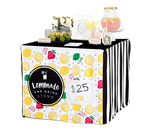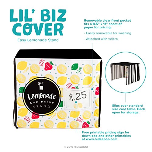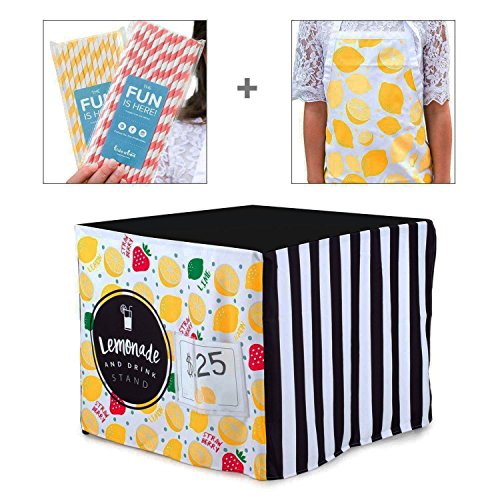 HIDEABOO Lil' Biz Easy Lemonade Stand (Black and White) Card Table Cover Bundle - Includes Children's Apron and 50 Paper Straws