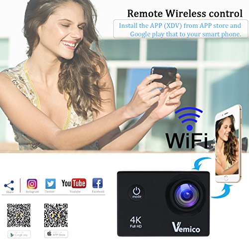 【WIFI APP Control】Connecting WIFI along with compatible APP and software, this makes the Vemico 4K one of the most popular action cameras. It allows you to control the cam from the XDV application that you use to fly the drone, videos and photos capturing. After downloading new snapshot from camera into your smart phone, they can be uploaded directly to social media.