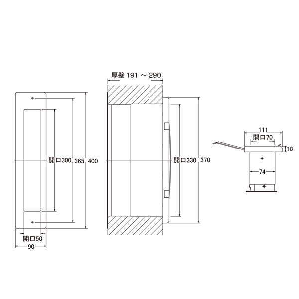 ●スペック:受口部:幅(mm)90 高さ(mm)400 取出し口開口寸法:幅(mm)69 高さ(mm)330 壁厚調整範囲191~290mm