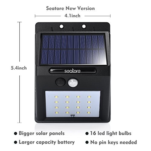 * New version: There are Bigger solar panel and Super bright 16 LED solar lights. 7 hours charging time for up to 12 hours working time during the night.