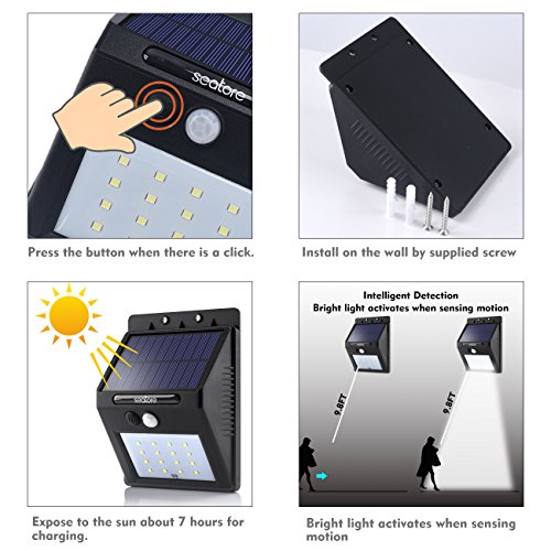* Easy to Operate: Wireless Solar Motion Sensor Lights which can be simply installed by the supplied two screws. NO extra pin needed to insert into the little hole to turn the lights on.