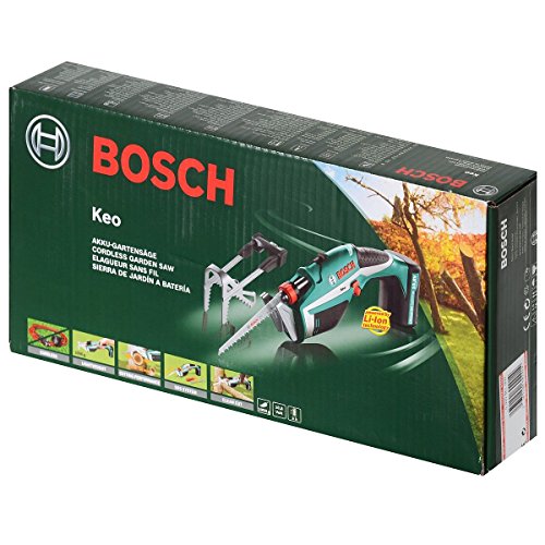 -. Feature : Bosch-Akku-Gartensäge Keo / Sägt mühelos selbst dicke Äste. / Müheloses Schneiden: vielseitige Hilfe rund um Haus und Garten. Schneidet bis zu 80 mm* dicke Äste durch einfaches Ziehen am Abzug. Ermöglicht 30 bis 190 Schnitte pro Akku-Ladung. / Problemlos: Abnehmbarer Haltebügel A-Grip" hält Äste beim Schneiden fest - keine zweite Hand erforderlich. / Immer einsatzbereit: kein Memory-Effekt und keine Selbstentladung dank Lithium-Ionen-Akku-Technologie. Elektronischer Zellschutz (ECP) schützt vor Überhitzung der Akkuzellen.