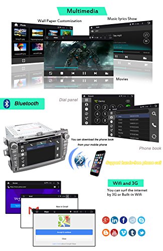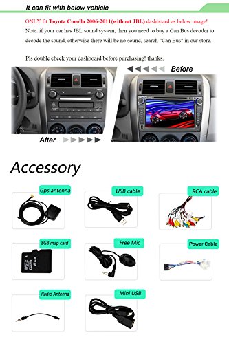 - Feature : The plug and play in-dash vehicle gps units fit to TOYOTA COROLLA 2007 -2011 without JBL system, if your car has JBL, then please buy a Can Bus Decoder B011ARL1NG / Double 2 Din car stereo loaded with pure Android 4.4.4 Kitkat, RK3188 1.6GHz Cortex A9 Quad Core CPU, Samsung DDR3 1GB RAM and 16GB flash memory, Mali 400MP GPU; Adopts Capacitive Digital 1024*600 HD screen, multi-touch, 175 viewing angle, day and night readable / Built-in GPS navigation; Bulit-in Bluetooth for hands-free calling and phone music playing; Support OBD2, AV-IN reverse camera, Digital Video Recorder, Steeing Wheel Control; Built-in WiFi, 3G and hotspot / Support iphone 4s 5 5c 5s 6 Airplay, Android phone Mirror link; 30 stations of analog AM/FM RDS radio; Support iPhone audio input, Play music or video via SD card or USB; Support Dual Zone function; Support 1080P video and 3D game; Support subwoofer and EQ, 4*50W power output / Free microphone, Free map in a Free 8GB map card; 12 months warranty for quality-related issues;