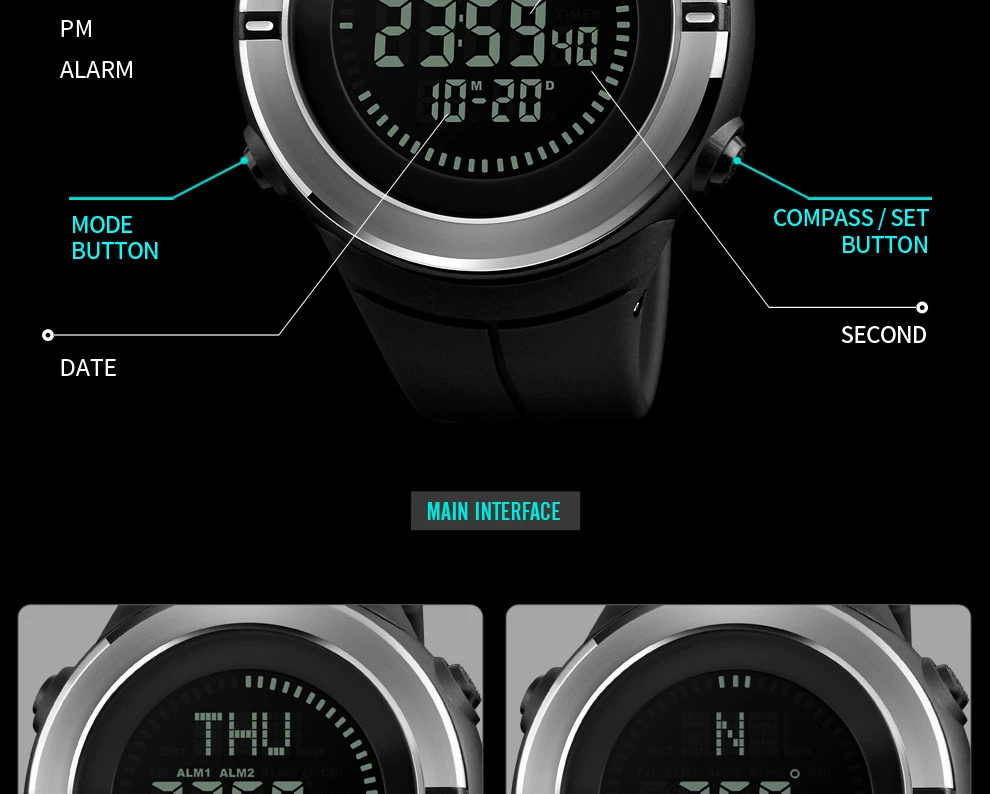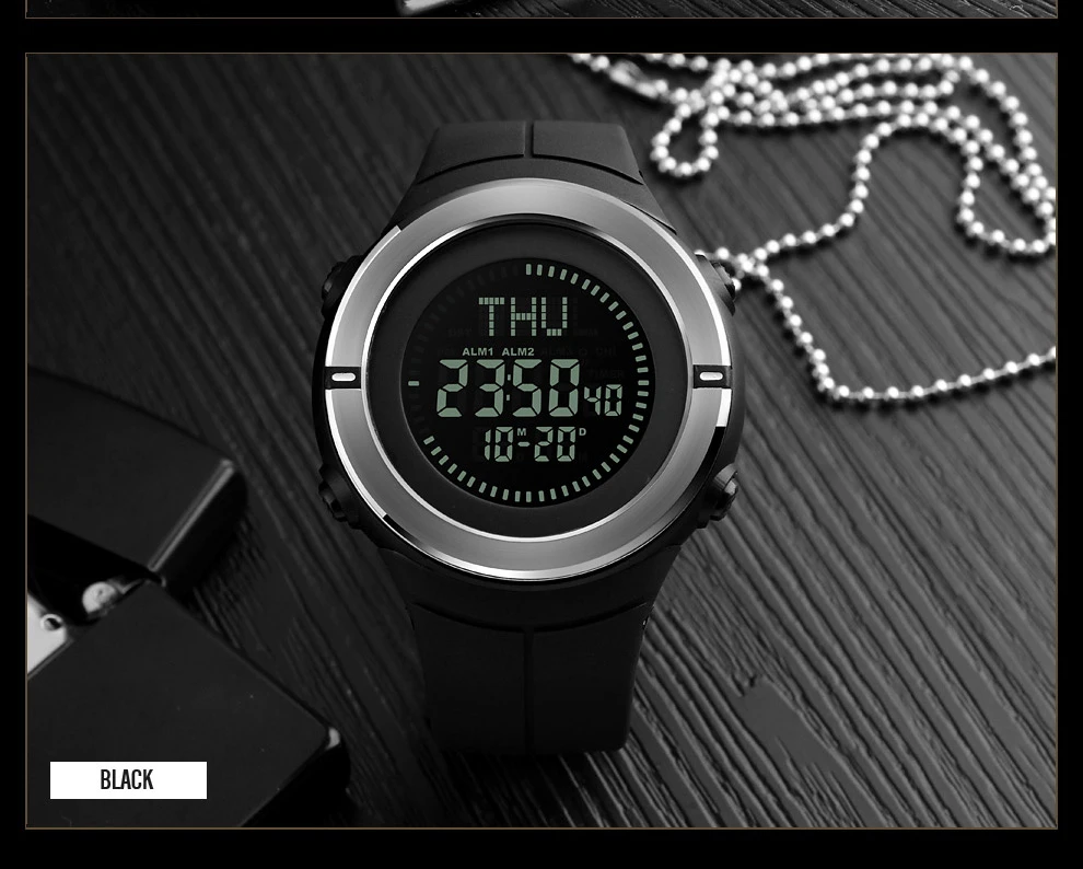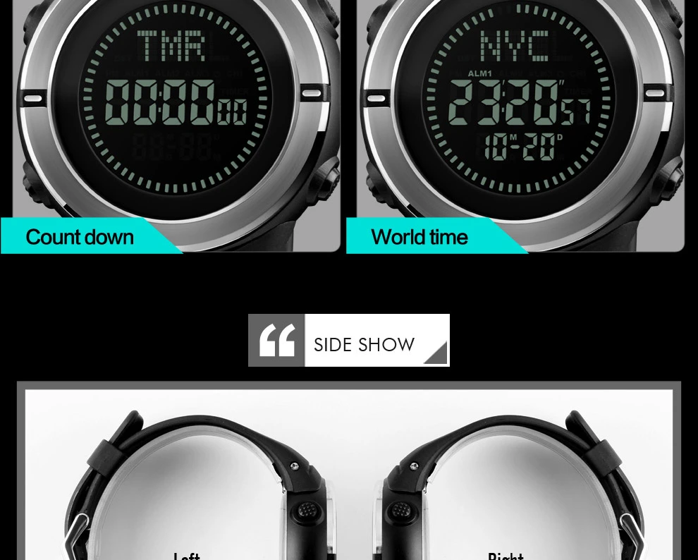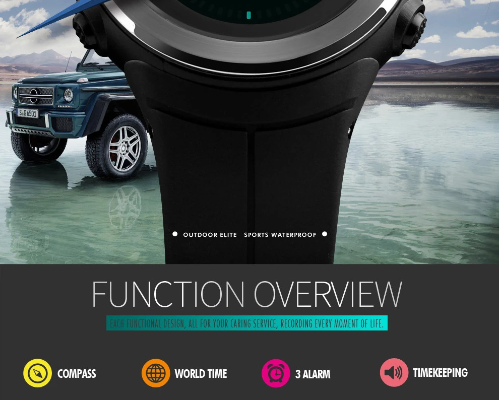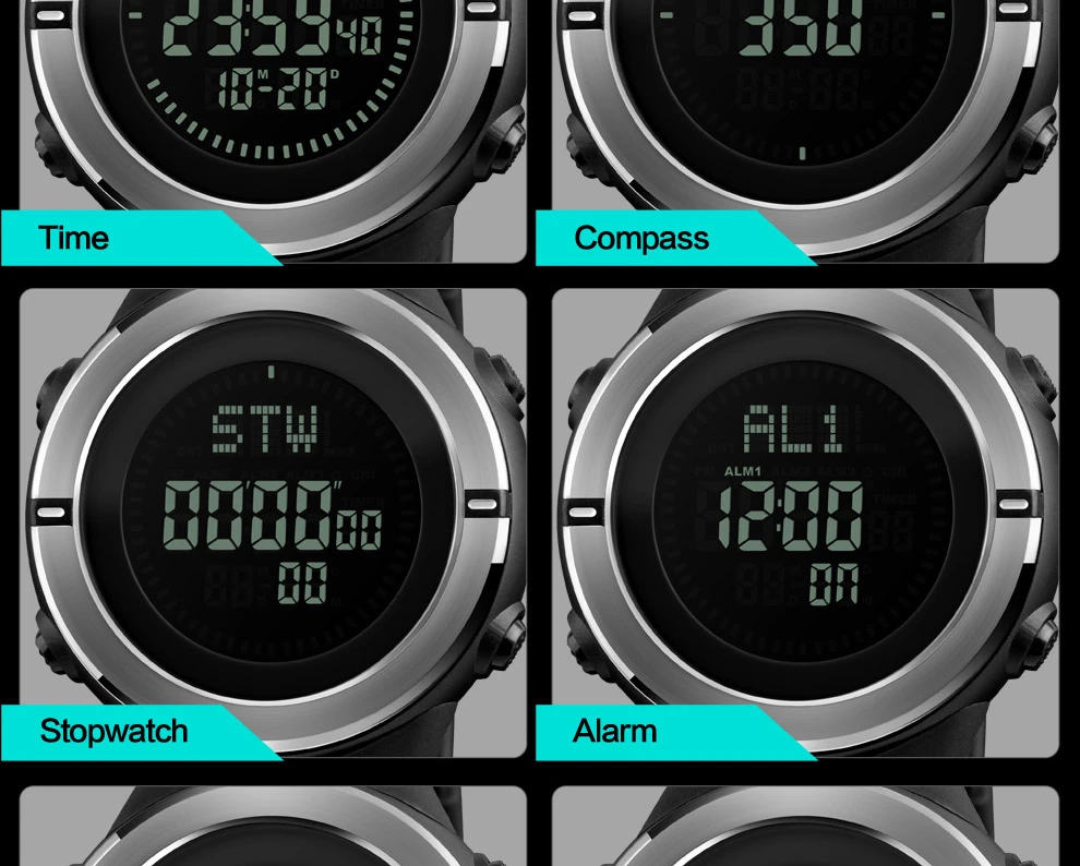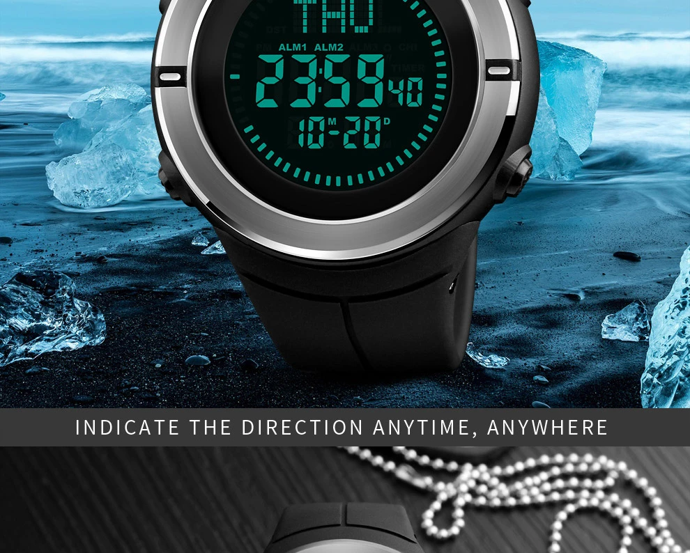 Feature:Complete Calendar,Week Display,Water Resistant,Compass,Stop Watch,Back Light,LED display,Alarm