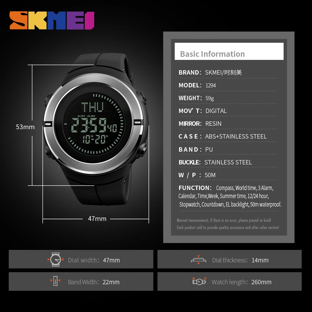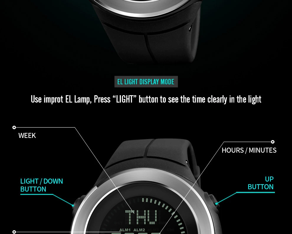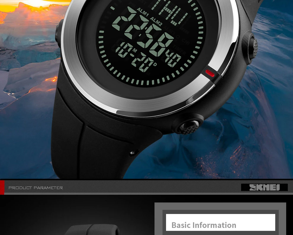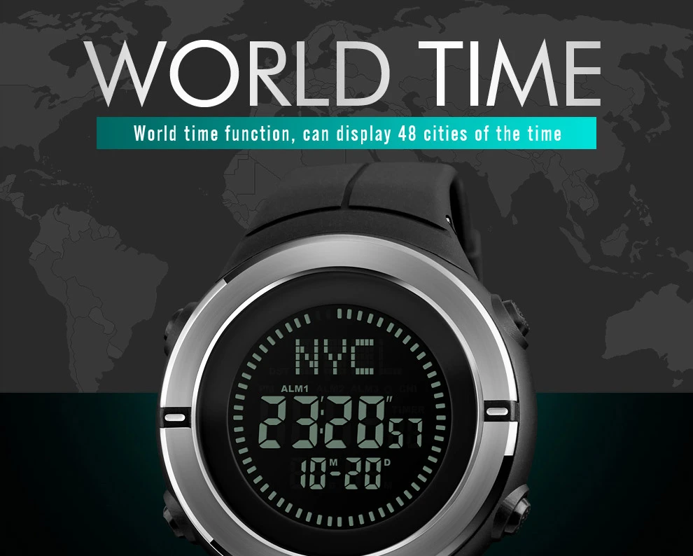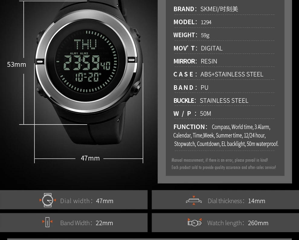 Feature:Complete Calendar,Week Display,Water Resistant,Compass,Stop Watch,Back Light,LED display,Alarm