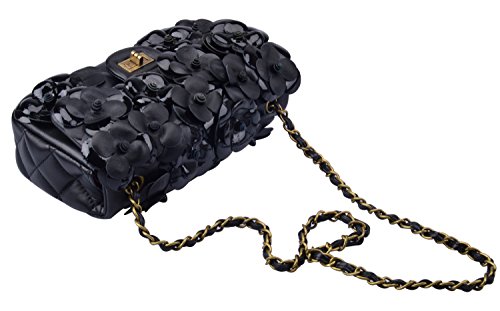 -. Feature : Synthetic lining / Golden sheepskiin flower, black patent leather flower / Chain strap / 10'' long, 2.7'' wide, 5.5'' high