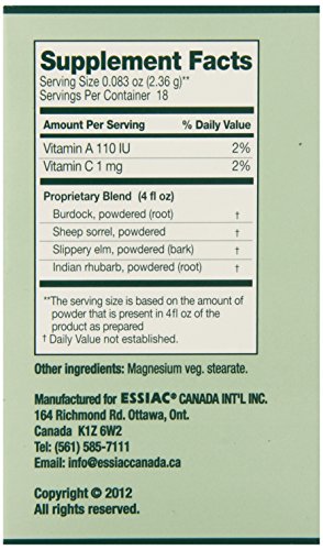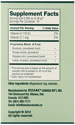 -. Binding : Health and Beauty -. Brand : Essiac -. EAN : 0623326003977 -. Feature : Helps Support the Immune System / Four main herbs that make up Essiac Tea are Burdock Root, Slippery Elm Inner Bark, Sheep Sorrel and Indian Rhubarb Root / Help normalize body systems by cleansing the blood, purging toxic build up, promoting cell repair and aiding in effective assimilation and elimination -. IsAdultProduct : 0 -. Label : Essiac International -. LegalDisclaimer : Statements made, or products sold through this web site, have not been evaluated by the Food and Drug Administration. They are not intended to diagnose, treat, cure, or prevent any disease. Information provided on this site is for informational purposes only and is not intended as a substitute for advice from your physician or doctor or any information contained on or in any product label or packaging. Always consult with a physician or licensed doctor before starting any diet, exercise or supplementation program, before taking any medication, or if you have or suspect you might have a problem. -. Manufacturer : Essiac International -. MPN : Epowder-1.5 -. NumberOfItems : 1 -. PackageQuantity : 1 -. PartNumber : Epowder-1.5 -. ProductGroup : Health and Beauty -. ProductTypeName : HEALTH_PERSONAL_CARE -. PublicationDate : 2014-06-26 -. Publisher : Essiac International -. ReleaseDate : 2014-06-23 -. Size : 1.5 -. Studio : Essiac International -. Title : Essiac International Herbal Supplement Powder, 1.5 Ounce -. UPC : 623326003977