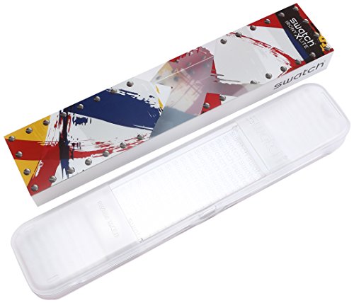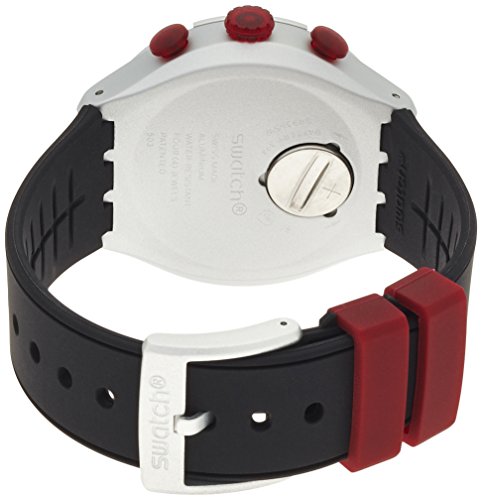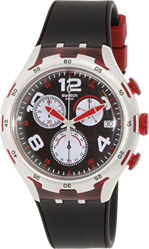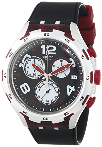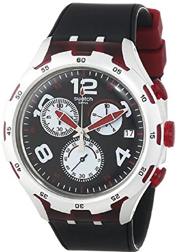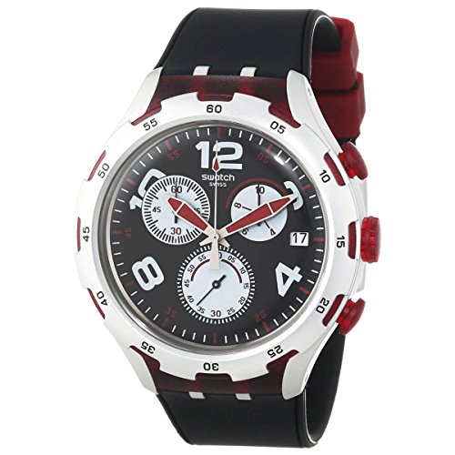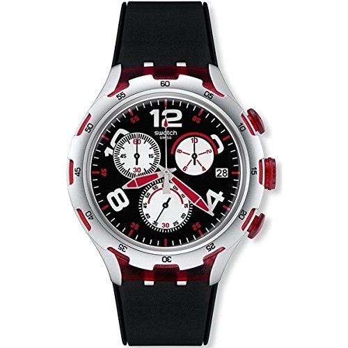 Studio : Swatch Publisher : Swatch Binding : Watch Product Description Aluminium case with a black silicone strap. Fixed aluminium bezel. Black dial with luminous hands and alternating Arabic numeral and index hour markers. Minute markers around the outer rim. Dial Type: Analog. Luminescent hands and markers. Date display at the 3 o'clock position. Chronograph - three sub-dials displaying: 60 second, 60 minute and 1/10th of a second. Quartz movement. Scratch resistant mineral crystal. Pull / push crown. Solid case back. Case diameter: 45 mm. Round case shape. Band width: 14 mm. Tang clasp. Water resistant at 30 meters / 100 feet. Functions: chronograph, date, hour, minute, second. Casual watch style. Swatch Red Wheel Chronograph Black Dial Black Silicone Mens Wartch YYS4004. 0