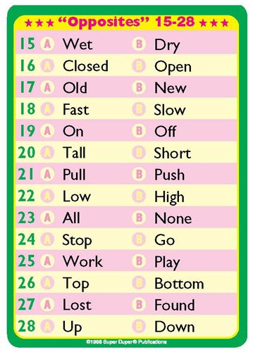 The Opposites Fun Deck contains 56 colorful, fun-filled cards that will motivate your children to develop their opposite relationship skills. It contains 28 pairs of illustrated cards along with a content list. Instructions and creative ideas add to the fun. All cards are 2 1/2" x 3 1/2".