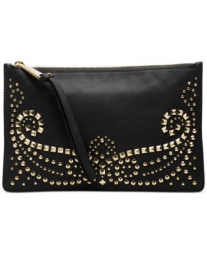 -. Feature : Treat everyday like the runway with the heavily embellished Rhea - a head-turning clutch packed with rock 'n roll flair. Turned out in luxurious lamb leather, the slender wrist strap provides carrying convenience. By MICHAEL Michael Kors. Imported Lamb leather Wrist strap with 7" drop Top zip closure Exterior features gold-tone hardware and stud detail Interior features 1 slit pocket and card slots 10-1/2" W x 6-1/2" H x 1" D
