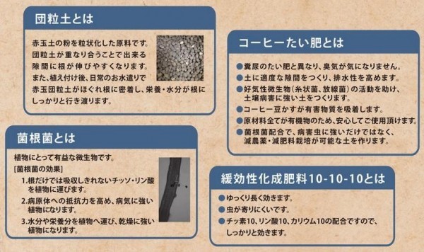 | 素材・材質 | 団粒土細粒、団粒土小粒、コーヒーたい肥、緩効性化成肥料 |