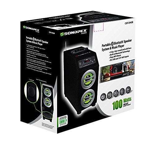 -. Binding : Electronics -. Brand : SONDPEX -. EAN : 0872535001872 -. Feature : Crisp, clear sound and heavy bass / Built-in Bluetooth / USB and SD card Slots (supports up to 32GB of memory each / Supports MP3/WMA music files / Built-in lithium battery lasts up to 4 hours -. Label : Sondpex Corporation of America -. Manufacturer : Sondpex Corporation of America -. MediaType : MP3 -. Model : CSF-D45B -. MPN : CSF-D45B -. PackageQuantity : 1 -. PartNumber : CSF-D45B -. ProductGroup : CE -. ProductTypeName : PORTABLE_AUDIO -. Publisher : Sondpex Corporation of America -. Studio : Sondpex Corporation of America -. Title : Sondpex CSF-D45B Portable Bluetooth Speaker System and Music Player -. UPC : 872535001872 -. Warranty : 180 days limited warranty