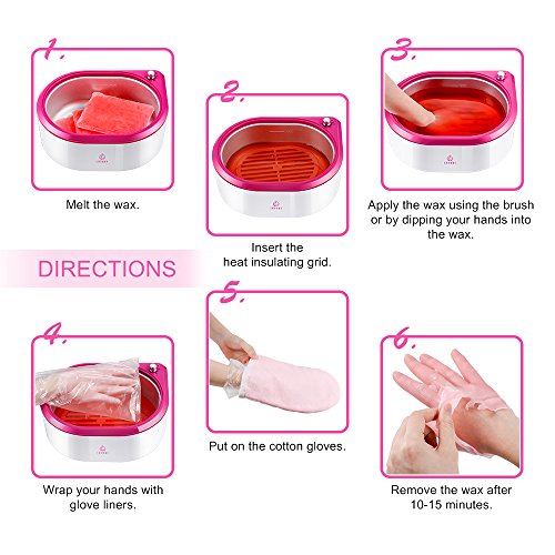 Package Contents 1 x Lavany Paraffin Wax Warmer 1 x Brush 3 x 200 g Paraffin Wax 50 x Glove Liners 2 x Thermal Mitts 1 x Heat Insulating Grid 1 x User Manual 0