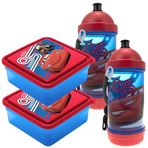Set Of 2 Disney Cars Sip N Snack Canteen Bottles, 2 Chillpak Sandwich Containers Lunch For Kids