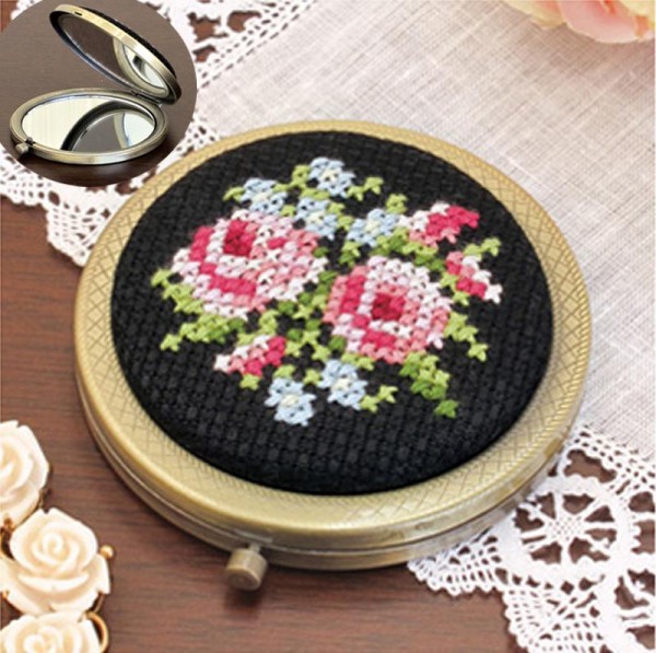 | 人気の花柄を上品にあしらった、エレガントな刺しゅう小物のキット。開くと片面は拡大鏡の両面コンパクトミラーです。技法はクロス・ステッチ。 |