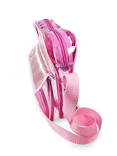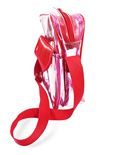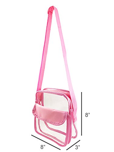 This is a clear cross-body bag with a long adjustable strap that makes it a multifunctional accessory. At its longest adjustment the clear bag strap easily sits over the shoulder while the clear bag itself rests comfortably on your hip. At the shortest adjustment the strap becomes a double handle allowing you to carry it as a clear handbag.