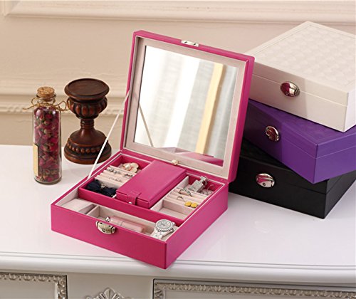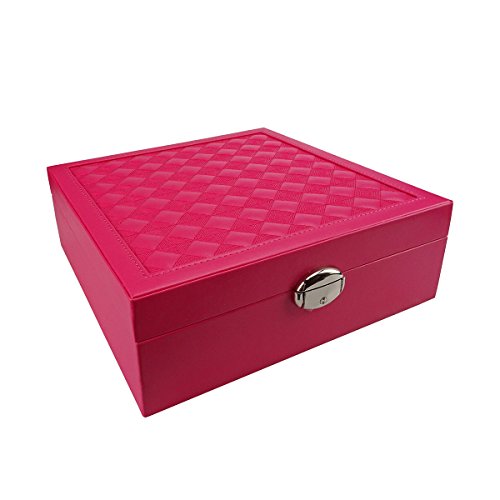 - The compartments hold necklaces, bracelets, rings, earrings, etc.Soft faux leather exterior, with a cushiony velvet interior, checker board pattern on the top with the different textured squares bring attractive appearance and durable quality.