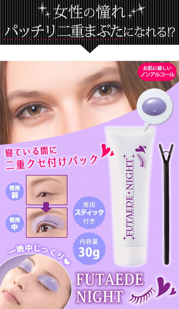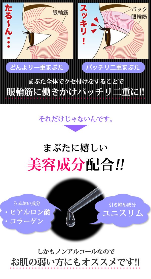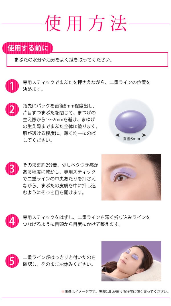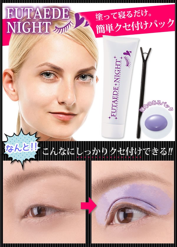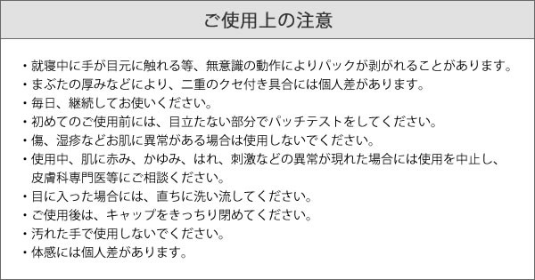 | 弾力のあるパックでまぶたに優しく、一晩しっかりクセづけができます。さらに引き締め成分配合で、くっきり度もアップ!!まぶたに嬉しいヒアルロン酸・コラーゲンも配合されています。 |