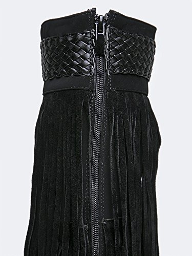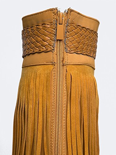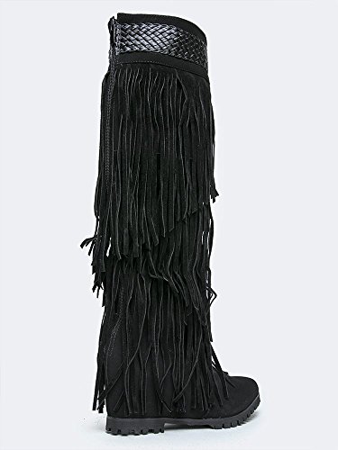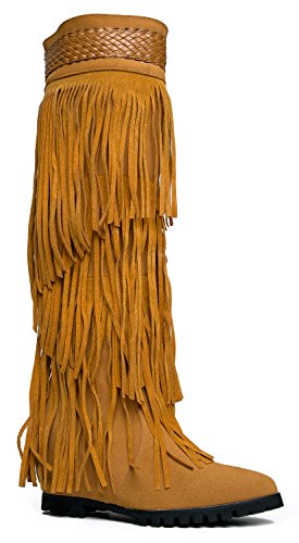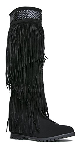Product Description Reel in the perfect look with these layered, fringe boots! Knee high boots have a pointed toe and are made with a vegan nubuck upper and has a braided trim around the cuff. 0