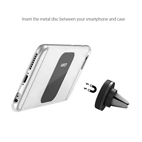 -. Feature : Ultrastrong Magnetic and no interference with your devices: Inside the magnetic base are 4 permanent magnets, which are aligned precisely to maximize a unidirectional, short distance magnetic force. This is a closed forced field that effectively reduces magnetic force beyond short range. Hence avoid any unnecessary interference with your smartphone and tablets. / UNIVERSALLY : compatible with two thin metal plate, which can insert into phone cover and back cases OR adhere to the back of your device; the circular metal plate will stick on the Mount, Please removed the circular piece of metal from the front of the magnet before using / EASILY : Clamps to car air vent and provides a stable platform for mounting your smartphone,such as the iPhone 6S, GPS and other devices, maximize convenience while driving / Daul-USE and STURDY : Not only for your car, can be used as stand anywhere,design with high quality rubber holder, easily insert into or remove from any car vent, hold firmly without causing any damage / PACKAGE CONTENT: Aukey Air Vent Mount Smartphone Holder, 1 x circular metal plate, 1x Ring metal plate, 1 x warranty card, 24 Month Worry-free Warranty.