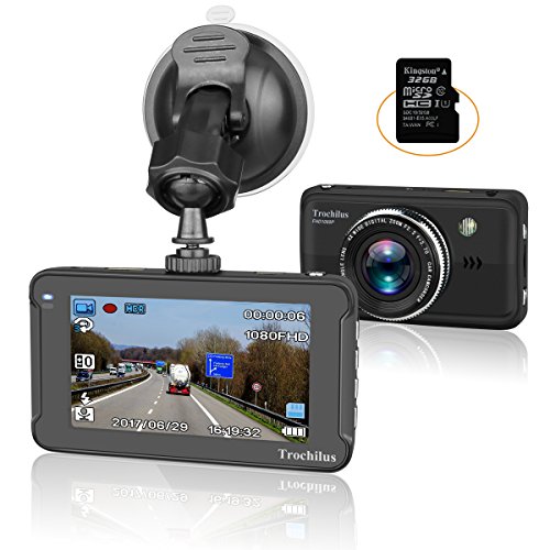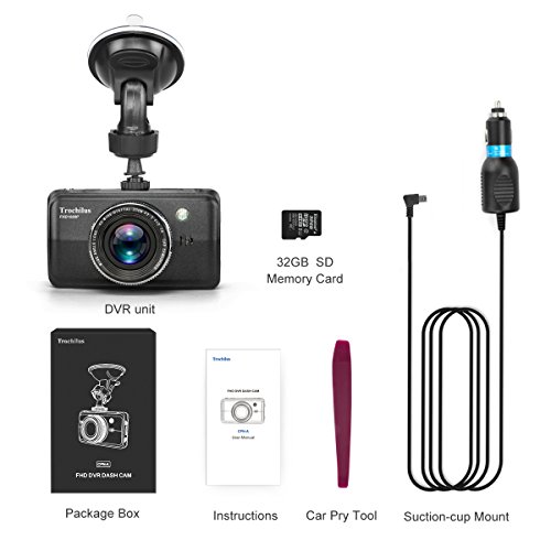 Car Dash Cam,Full HD 1080P 3" Screen DVR Camera Trochilus with 32GB SD Card, 170 Degree Wide Angle Lens , Night Vision, WDR, G-Sensor, Loop Recording, Parking Guard, Car Pry Tool Included