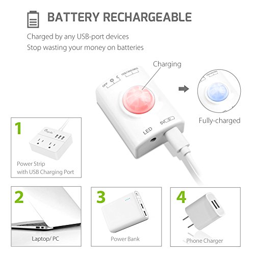 - USB BATTERY RECHARGEABLE: Powered by built-in Li-ion battery which can be charged by any USB-port devices with the included USB charging cable. Stop wasting your money on batteries. Get around 2 months of light on one full charge with average use of 5-6 activations a day (15s timer).