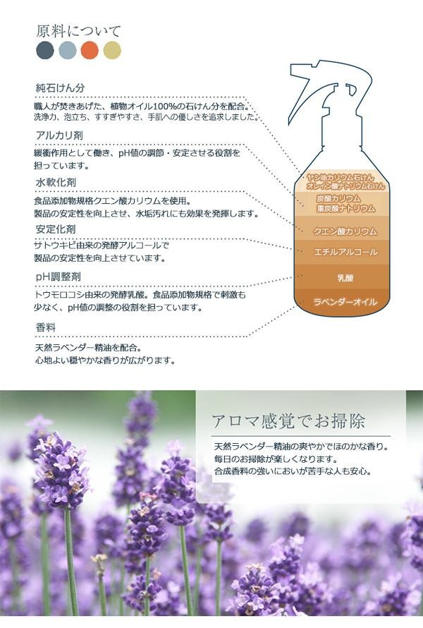 | 成分 | 純石けん分(8%脂肪酸カリウム)、炭酸塩、重曹、クエン酸塩エチルアルコール、乳酸、天然ラベンダー精油 |