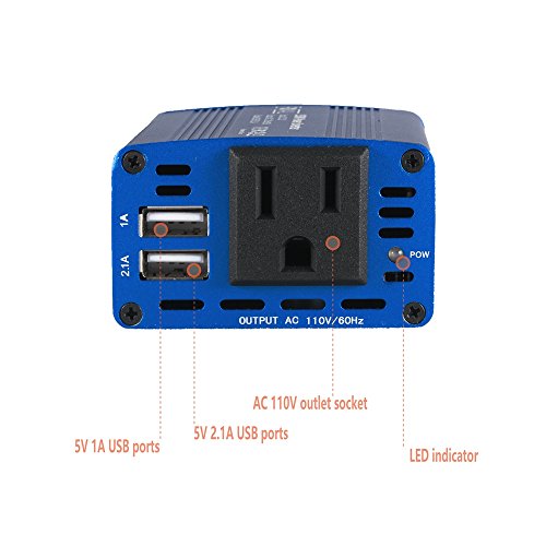 Premium 150w car power inverter with 2 USB ports and AC outlets. Dual USB ports can charge most phones and tablets simultaneously (Max 3.1A total output), while AC outlets great for charging laptop, breast pump, CPAP machine, nebulizer, game console, kindle, TV, DVD players, lights, iPad, and other electronic devices