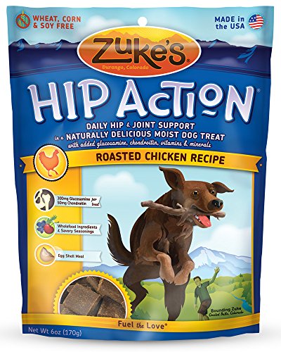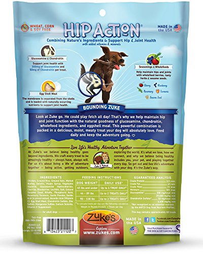 Natural Hip & Joint Support in a tasty treat. Help maintain hip and joint function with 300mg glucosamine, 50mg chondroitin, and eggshell meal in every nutrient-rich treat. Zuke's Hip Action will help keep your dog going without the fuss of messy pills or powders. Made in the USA.