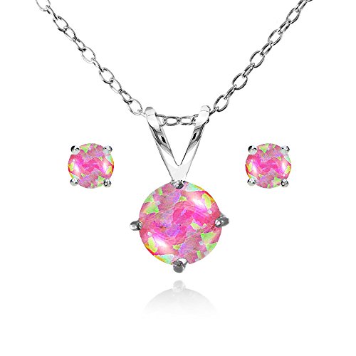 This classic jewelry set showcases a round solitaire pendant and matching stud earrings. The pendant showcases a sparkling 7mm simulated white opal gemstone and dangles from a thin 18-inch rolo chain. The stud earrings feature two 5mm simulated white opal stones and is secured with post and friction backs. The jewelry set is crafted of sterling silver.