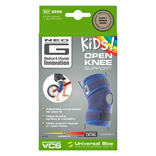 -. Feature : PERFECT KIDS KNEE SUPPORT FOR ACTIVE LIFESTYLES: Premium quality support featuring non-slip design for ultimate comfort and support, suitable for everyday activities and sports including running, skiing, golf, football, basketball, soccer, hiking, walking & many more / PAIN RELIEVING KNEE BRACE: Medically engineered to help relieve pain associated with juvenile arthritis, aching joints, as well as aid recovery from meniscus injuries, patella injuries and runners knee. Reduces stress and strain, providing stability to weak and injured knees / MEDICAL GRADE: Registered internationally as a Class 1 Medical Device with regulatory bodies, such as the MHRA (UK), FDA (US) and Health Canada. Manufactured to the highest quality and compliant standards, Neo G is also the official Partner of The Chartered Society of Physiotherapy / OPEN PATELLA DESIGN & PREMIUM GRADE NEOPRENE: The open patella design and stitched buttress helps with patella tracking, providing added support, whilst the durable, heat therapeutic neoprene helps warm muscles and joints / ONE SIZE AND FULLY ADJUSTABLE COMPRESSION FOR BEST FIT: Universal size (fits up to approximately age 12), fits the Left or Right knee and is Unisex suitable for girls and boys. The adjustable compression system ensures blood flow safety and gives support to the knee complex