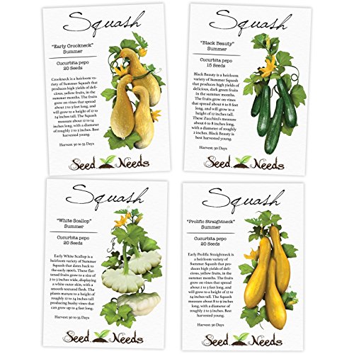 This assortment of Summer Squash includes packets for Early Crookneck, Early Prolific Straightneck, Early White Scallop and Black Beauty Zucchini.