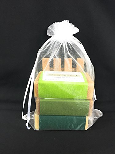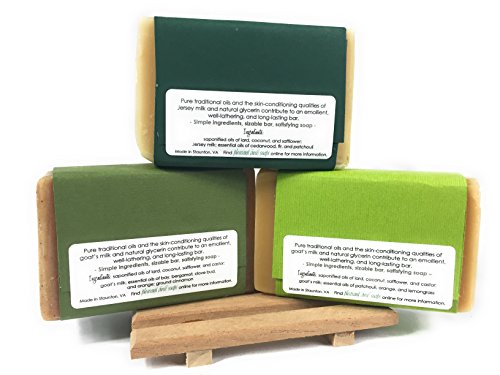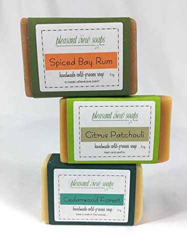Natural Handmade Soap Gift Set - 3 Large 5 Ounce Bars with Aromatic Cedar Dish - Essential Oil Scents: Spiced Bay Rum, Citrus Patchouli, Cedarwood...