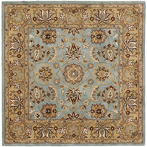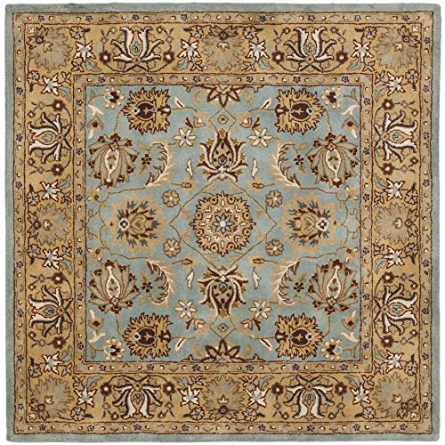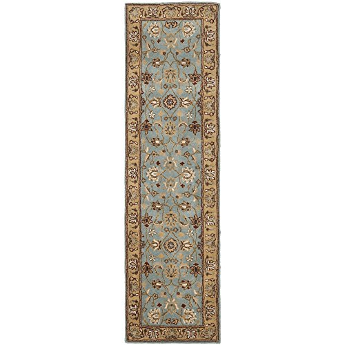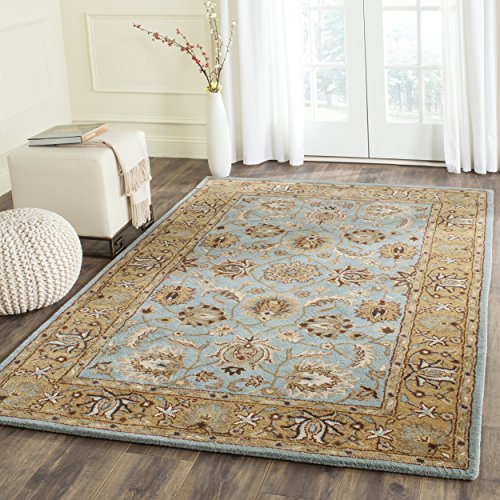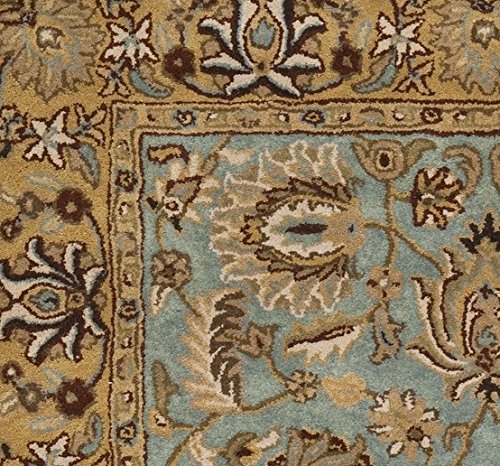 Add traditional charm to your home with this handmade Oriental rug from Safavieh. Hand-tufted of 100-percent pure wool with a strong cotton backing, this rug is expertly crafted to be just as intricately beautiful as it is durable. Displaying some of the finest Persian and European exemplary designs, this rug features a lovely blueish teal backdrop with a charming transitional floral pattern. The color palette of this rug includes shades of tan, beige, grey, cream and gold to complement the gorgeous blue field. Due to the variety of colors, this rug can be repurposed to fit in a variety of different rooms and match a multitude of décors.