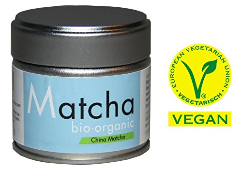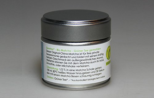 -. Feature : Quertee - China Bio Matcha Pulver - 30 g Dose / 100 % Vegan - Zertifiziert durch das V-Label des Vegetarierbund Deutschland e.V. (VEBU) / In Steinmühlen zu feinem Matcha Pulver gemahlen / Matcha Bio Tee für Ihre Teezeremonie oder auch als Matcha Geschenk / Der Bio Matcha Tee ist auch für die Zubereitung von Matcha Latte, Cocktails, Smoothies, Müsli, Milchshakes, ... geeignet