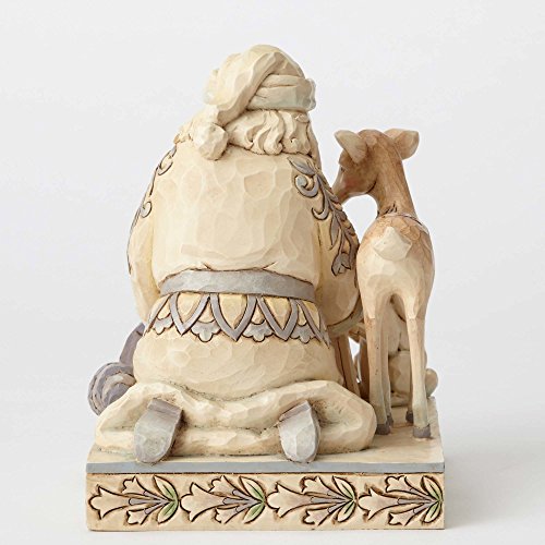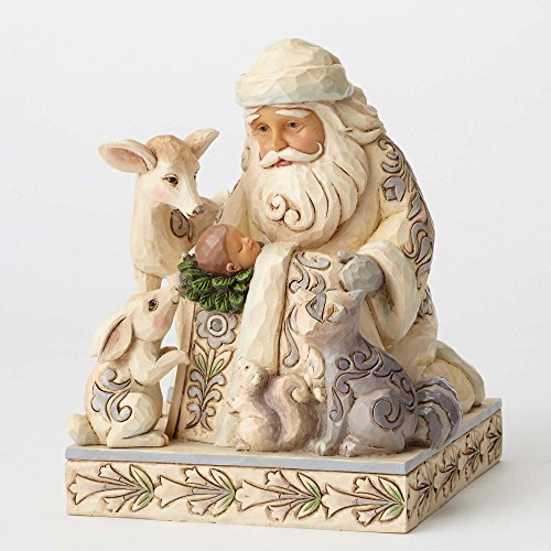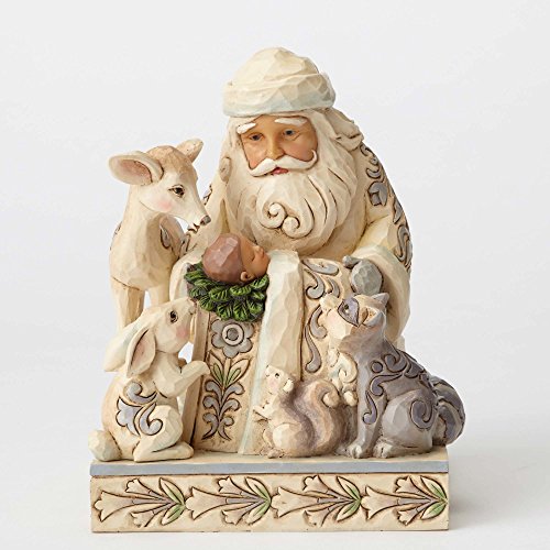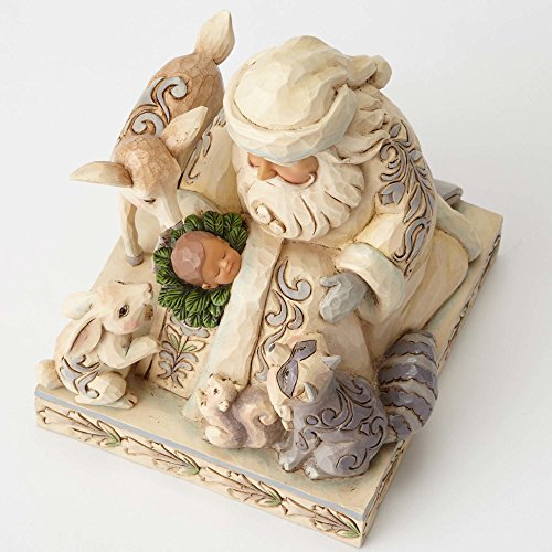 Miracle In The Moonlight. White Woodland Santa with Baby Jesus Figurine. Part of the Heartwood Creek collection by Jim Shore. Made from stone resin. Approximately 6.5 inches tall (17 cm). Includes original manufacturers box and packaging. Made by Enesco. Jim Shore's depictions of Santa worshiping the Baby Jesus are some of his most heartfelt and inspirational creations. This endearing piece rendered in subtle hues features a reverent host of Woodland creatures paying homage at Santa's side.Feature