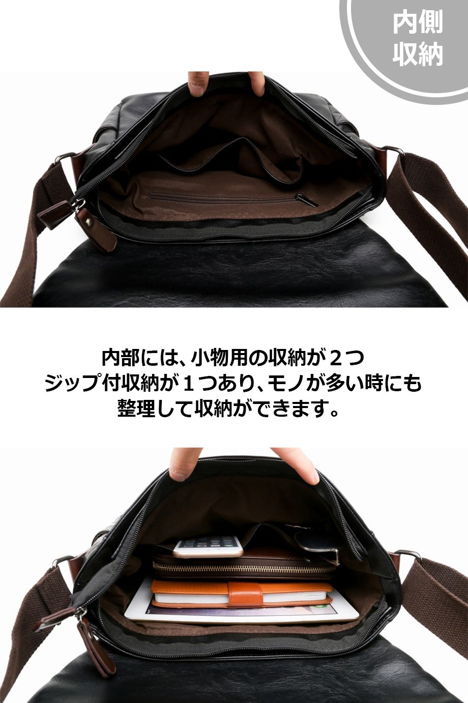 Inside, there are two storage for small objects, one storage with zip, can be stored even when there are many items.