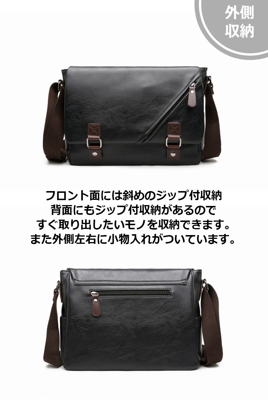 There is oblique zip on the front side, storage on the back also with zip so it is convenient to store the things you want to take out immediately.